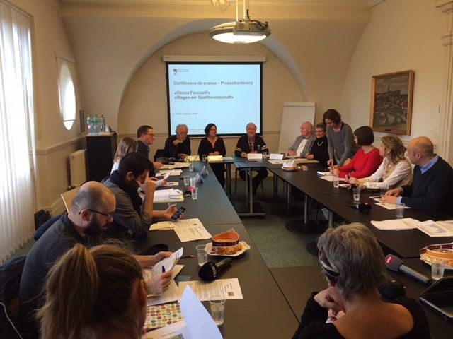 « Osons l’accueil ! » est ainsi née et nous organisons 3 jours après, le 9 septembre un point de presse pour faire connaître à la population fribourgeoise notre action.